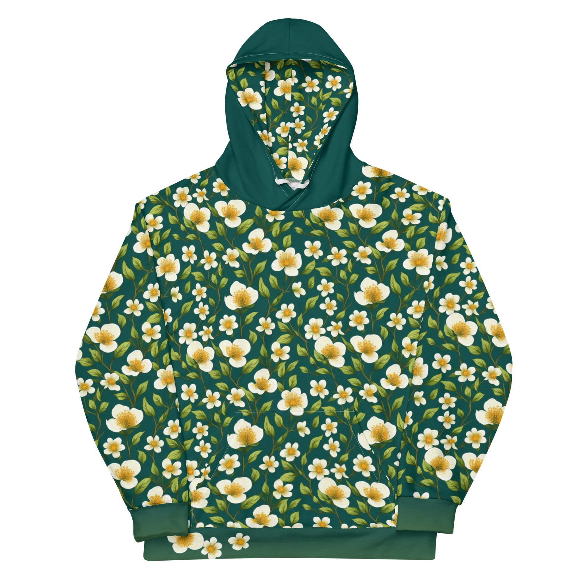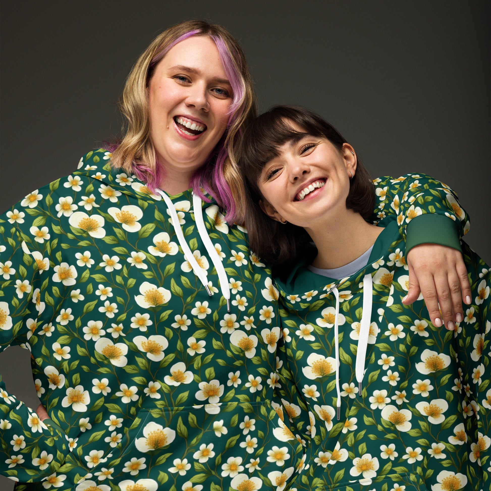 Experience the charm of springtime year-round with 'Dogwood Days,' our all-over print hoodie celebrating the timeless beauty of dogwood blossoms. This comfy unisex hoodie has a soft outside with a vibrant print and an even softer brushed fleece inside. The hoodie has a relaxed fit, and it’s perfect for wrapping yourself into on a chilly evening.