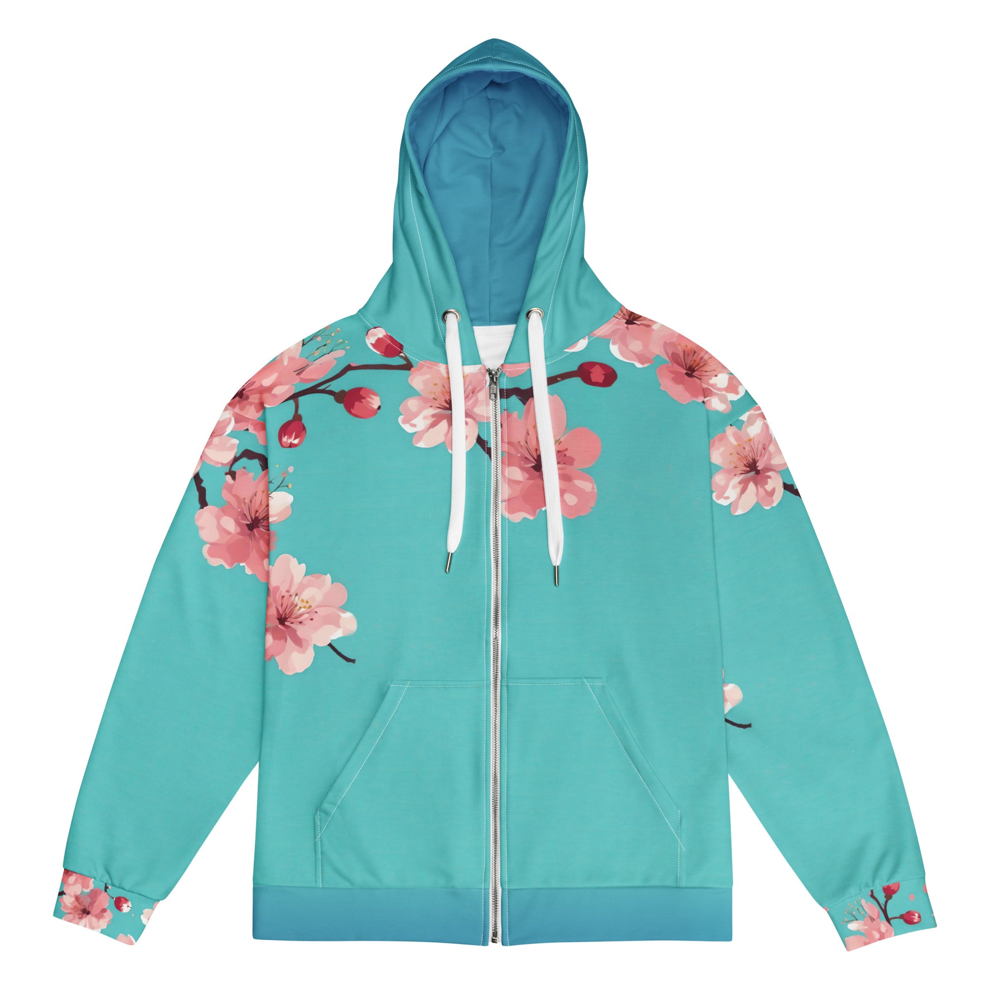 Indulge in the enchanting beauty of spring with our 'Pink Petals' all-over print hoodie, adorned with delicate cherry blossoms in full bloom, offering a touch of elegance and the essence of renewal to your wardrobe. Meet the zip hoodie—a must-have for everyday wear. Crafted from 95% recycled polyester, it combines sustainability with style. Soft both inside and out, this unisex hoodie offers a relaxed fit with drop shoulders. Plus, it’s designed to last, keeping you cozy and fashionable for years to come.