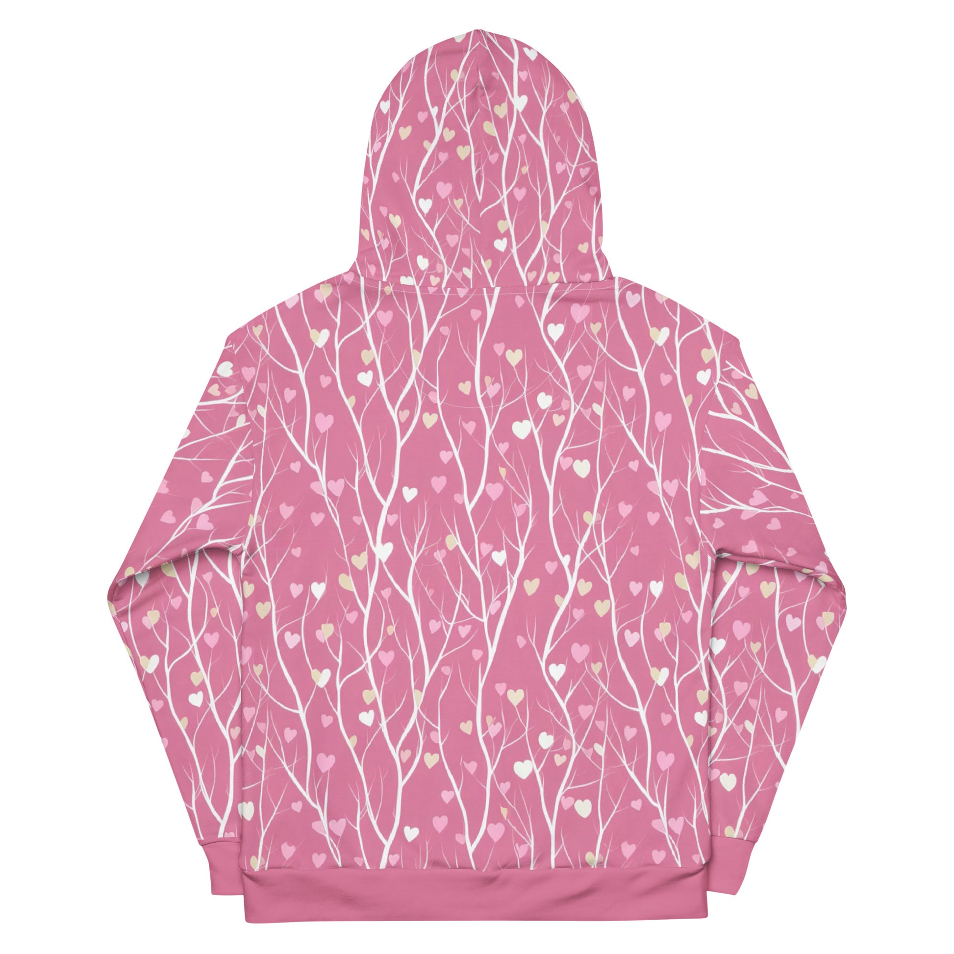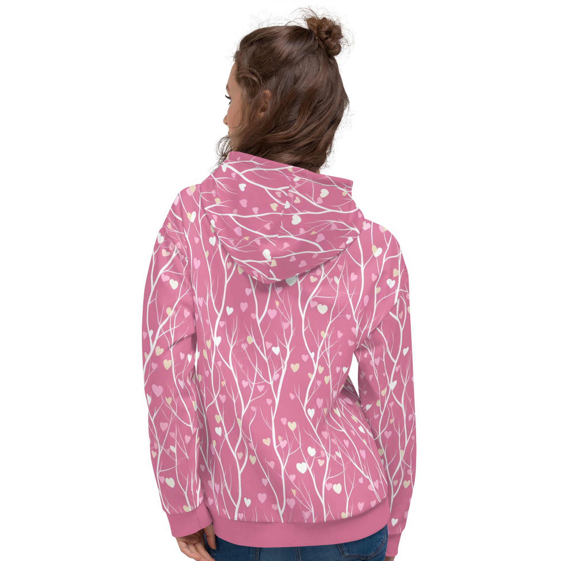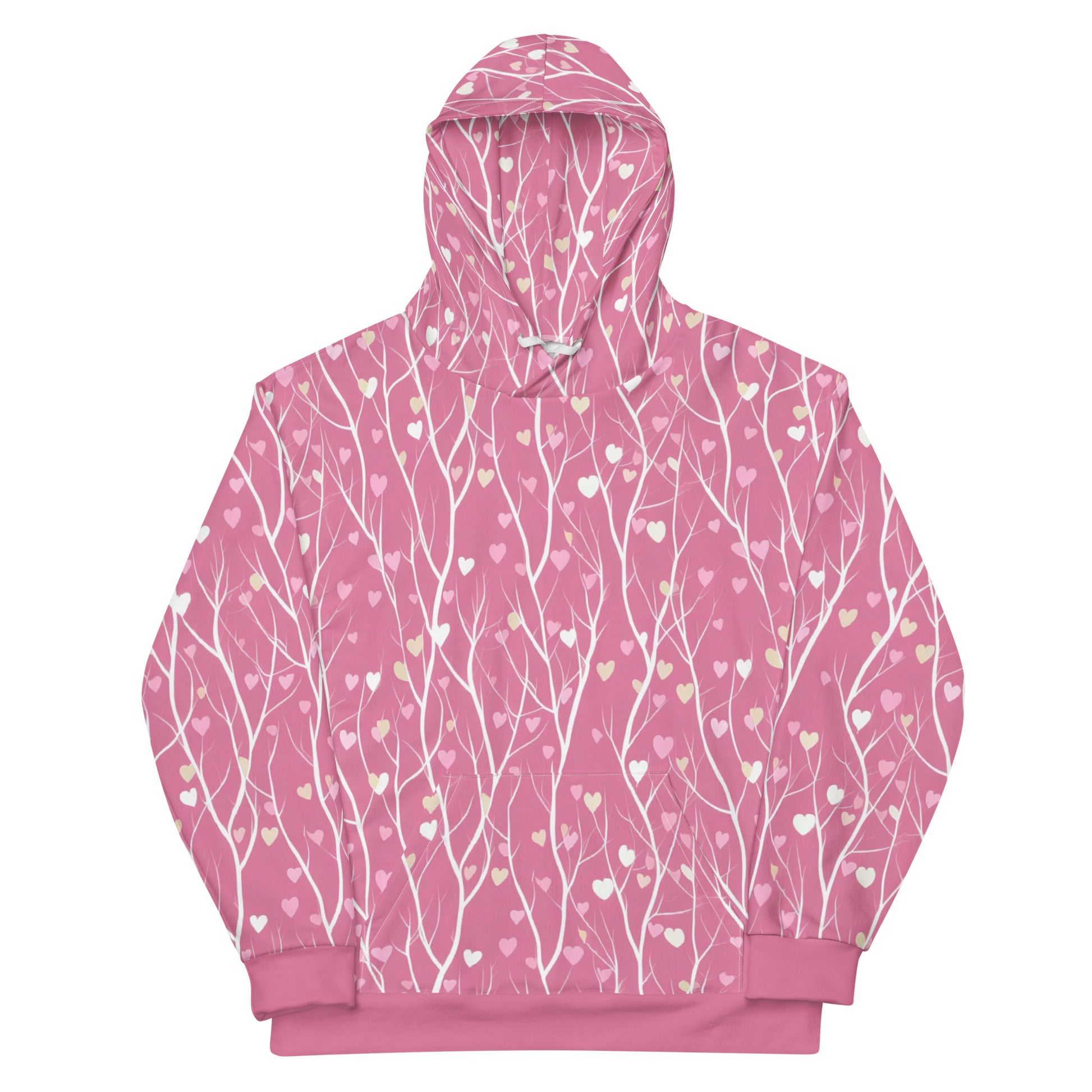 Dive into a realm of love and warmth with 'The Heather,' our enchanting all-over-print hoodie, adorned in soft pink hues featuring delicate white branches and hearts, a perfect embrace of love and comfort. This comfy unisex hoodie has a soft outside with a vibrant print and an even softer brushed fleece inside. The hoodie has a relaxed fit, and it’s perfect for wrapping yourself into on a chilly evening.